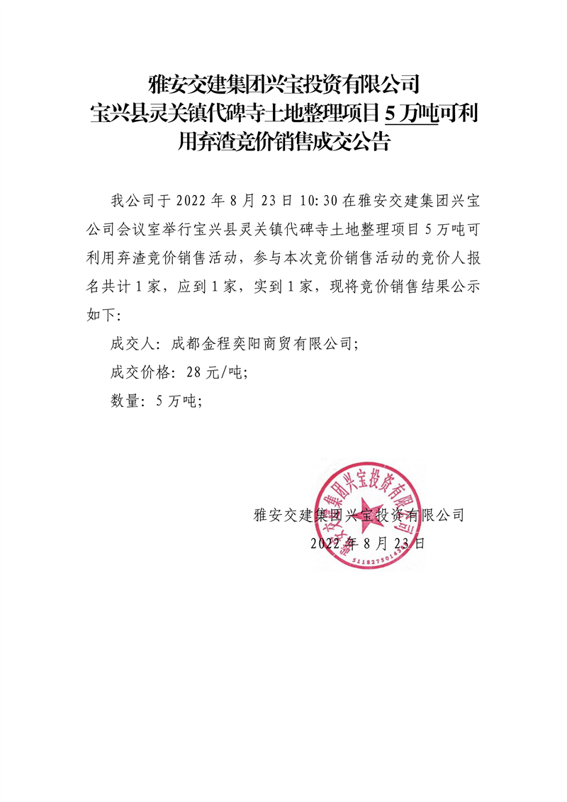 雅安交建集團(tuán)興寶投資有限公司寶興縣靈關(guān)鎮(zhèn)代碑寺土地整理項(xiàng)目5萬噸可利用棄渣競(jìng)價(jià)銷售成交公告(8.23)