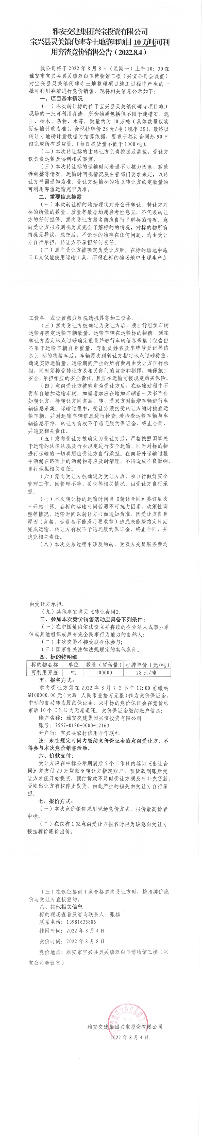 雅安交建集團興寶投資有限公司靈關鎮(zhèn)代碑寺土地整理項目10萬噸可利用棄渣競價銷售公告(2022.8.4)