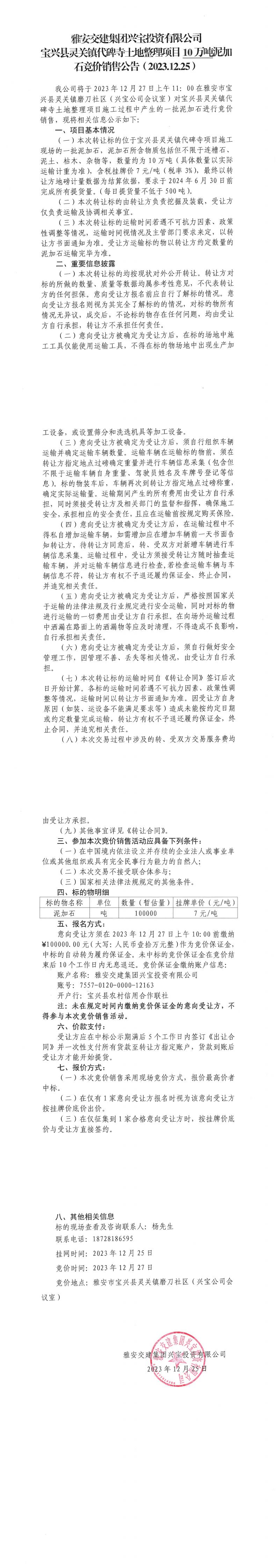 雅安交建集團(tuán)興寶投資有限公司10萬噸泥加石競(jìng)價(jià)銷售公告(2023.12.25)