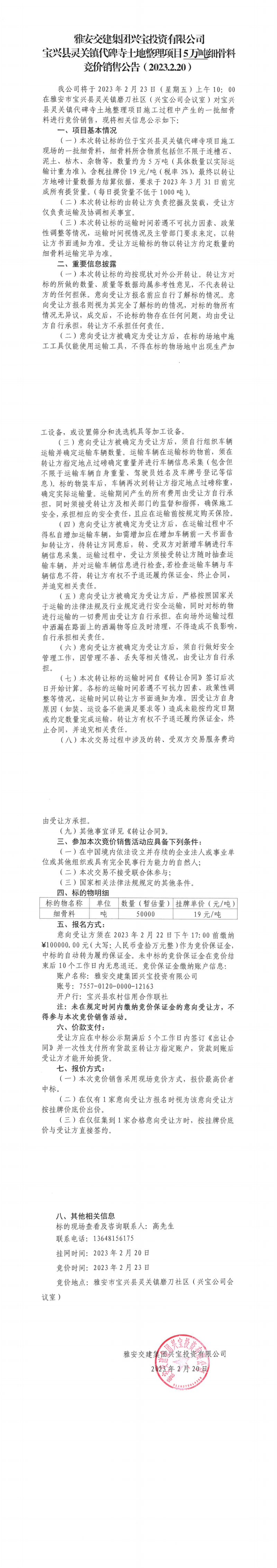 雅安交建集團(tuán)興寶投資有限公司靈關(guān)鎮(zhèn)代碑寺土地整理項目50萬噸可利用棄渣競價銷售公告(2023.2.20)、