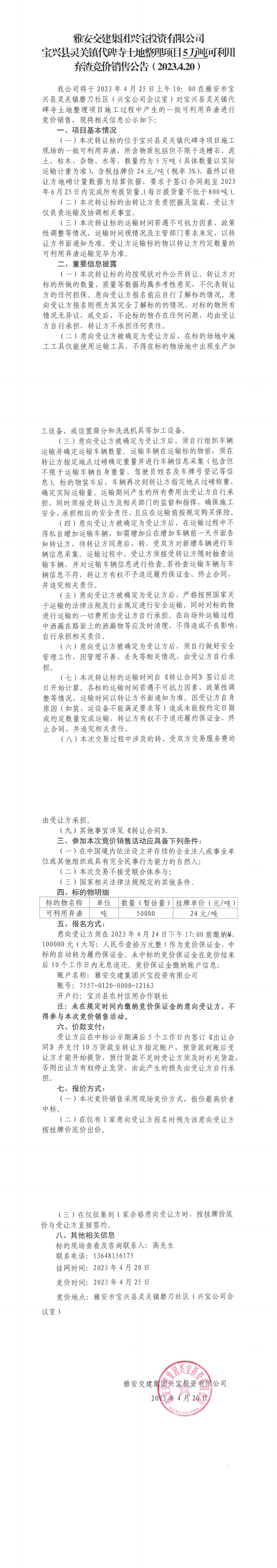 雅安交建集團興寶投資有限公司靈關鎮(zhèn)代碑寺土地整理項目5萬噸可利用棄渣競價銷售公告(2023.4.20)