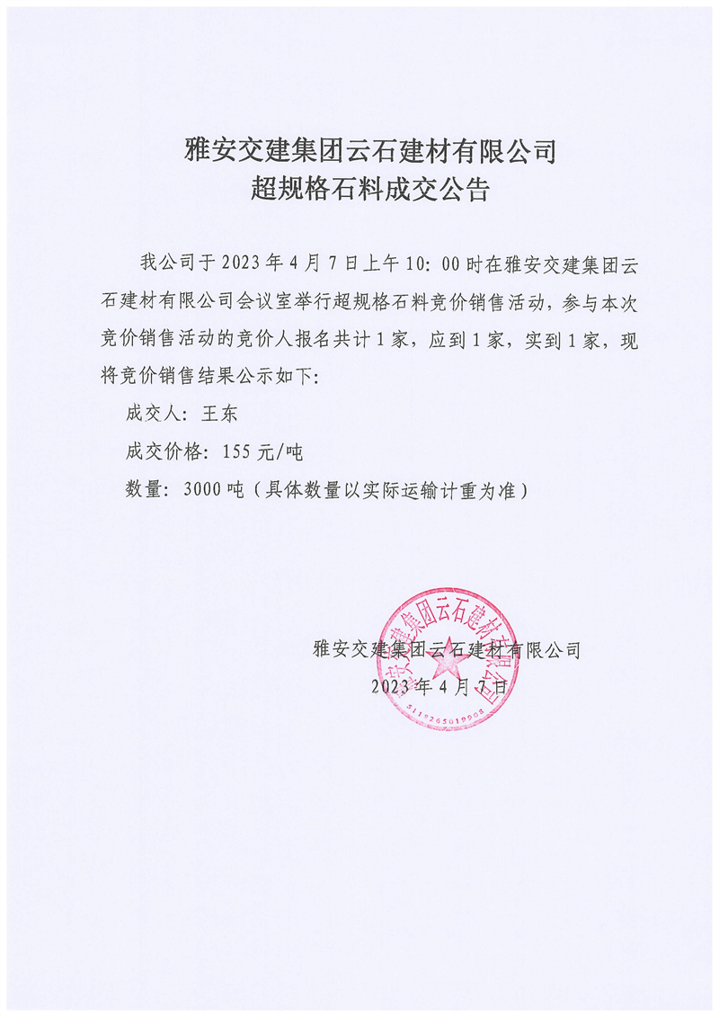 雅安交建集團(tuán)云石建材有限公司超規(guī)格石料拍賣成交公告(2023-4-7)