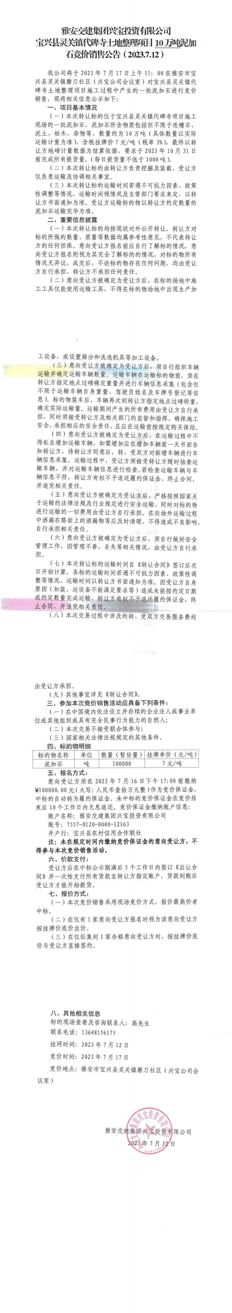 雅安交建集團(tuán)興寶投資有限公司寶興縣靈關(guān)鎮(zhèn)代碑寺土地整理項(xiàng)目10萬(wàn)噸泥加石競(jìng)價(jià)銷售公告(2023.7.12)