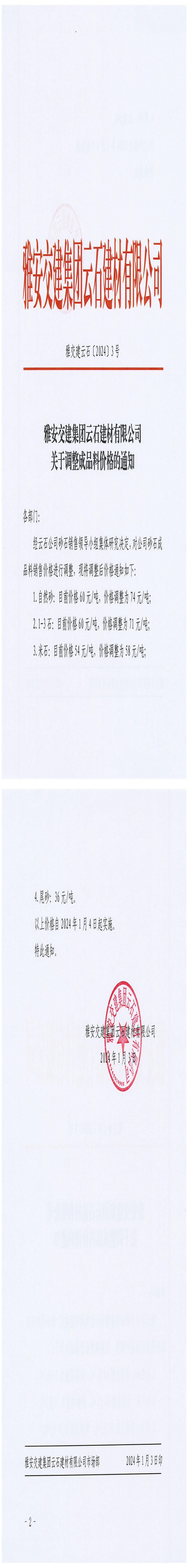 雅安交建集團(tuán)云石建材有限公司成品料價格調(diào)整公告(2024-01-04)