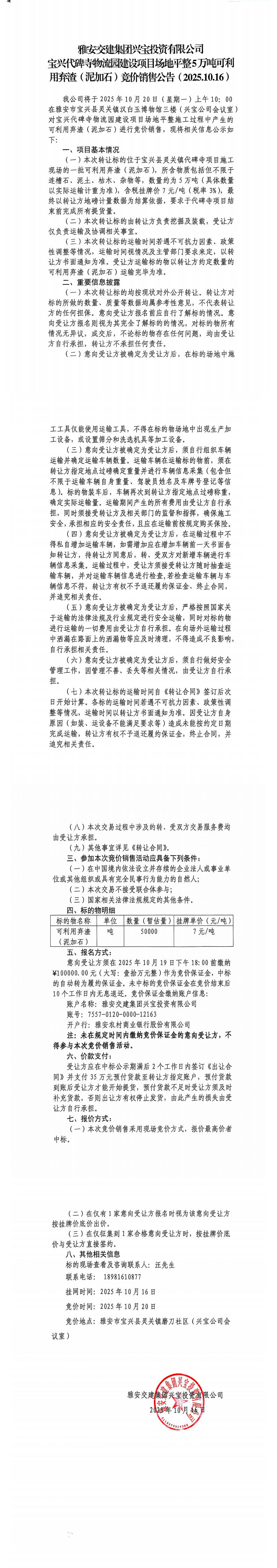 雅安交建集團(tuán)興寶投資有限公司寶興代碑寺物流園建設(shè)項(xiàng)目場(chǎng)地平整5萬(wàn)噸可利用棄渣(泥加石)競(jìng)價(jià)銷(xiāo)售公告(2025.10.16)